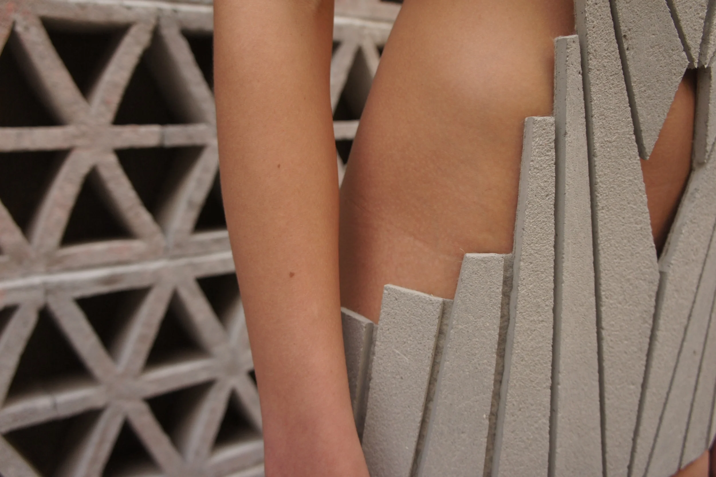 Nos interesaba la relación estructural entre el cuerpo mismo y las piezas que conforman la prenda. Esta relación reciproca donde la prenda depende del movimiento del cuerpo pero a su vez, impone cierta adaptación de estos movimientos a partir de su morfología. Uno de los retos principales de este proyecto era el de darle flexibilidad a un material enteramente rigido. Logramos esto usando un sistema compuesto, donde una capa de fieltro recibe el concreto fresco que al fraguar, resulta en una sucesión de rigideces y flexiblidades directamente fusionadas. No se trata de la adhesión de unas piezas a otro material, sino la unión indivisible de ambos.