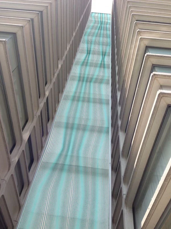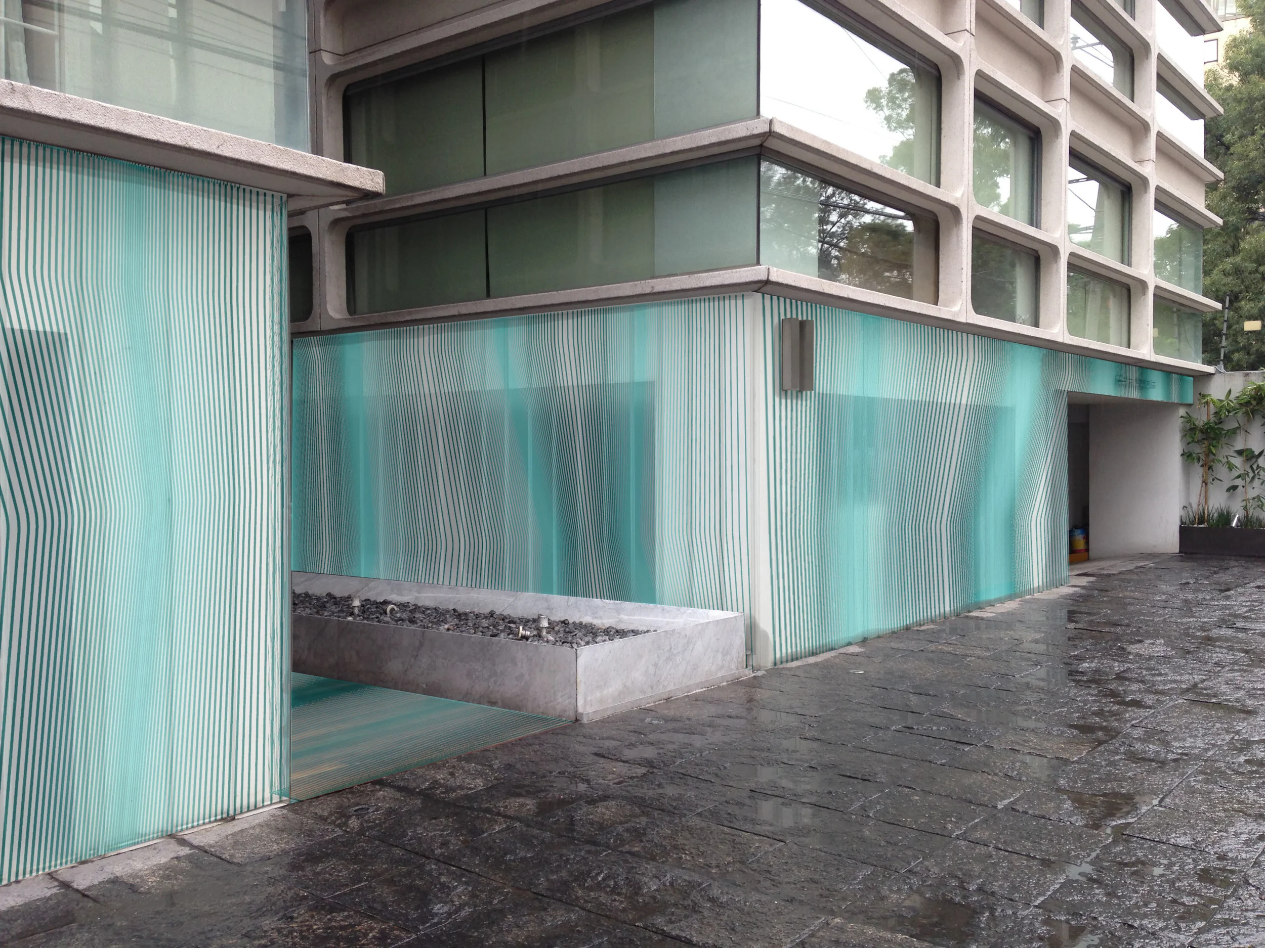 Se solicitó la intervención de la fachada que diera identidad al edificio sin necesidad de una obra mayor. El patrón sería serigrafiado en cristal garantizando su durabilidad y permitiendo la regulación variable de iluminación desde el exterior al interior.